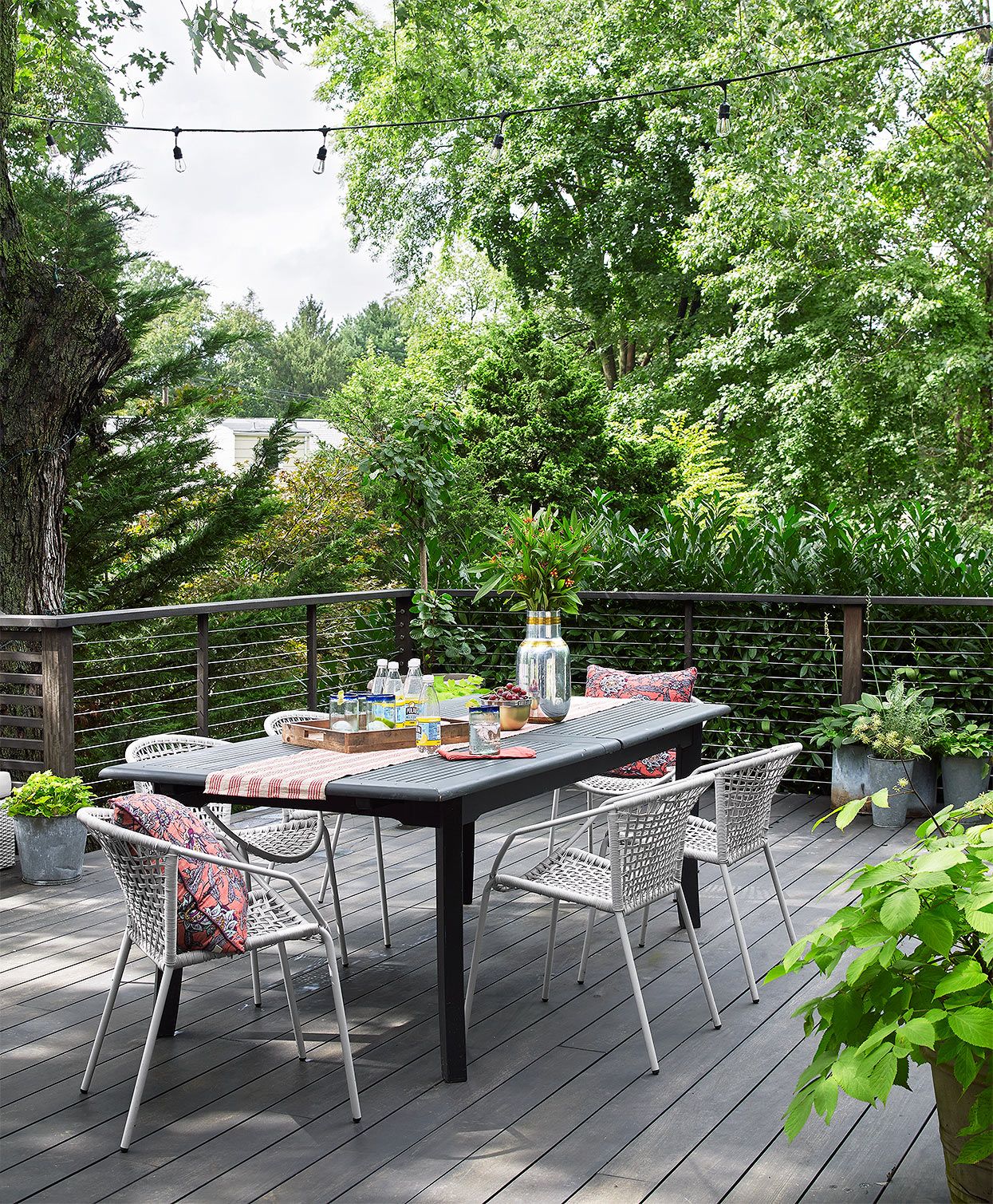 If you like to host outdoor gatherings, devote your small deck to a dining table and chairs. Consider choosing furniture that can easily transition from one setting into another. A dining table, for example, can moonlight as a buffet during outdoor get-togethers. Lightweight chairs with narrow legs take up minimal space around the table and can easily be shifted to different spots of the deck when needed.